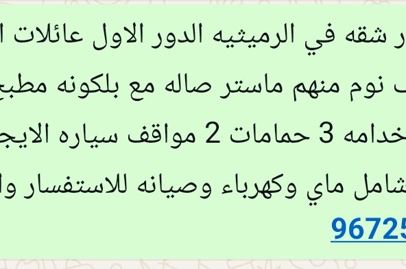 للايجار شقه في الرميثيه الدور الاول عائلات الوصف 3 غرف نوم منهم ماستر صاله مع بلكونه مطبخ كبير غرفه خدامه 3 حمامات 2 مواقف سياره الايجار 550 دينار شامل ماي وكهرباء وصيانه للاستفسار واتساب 96725110